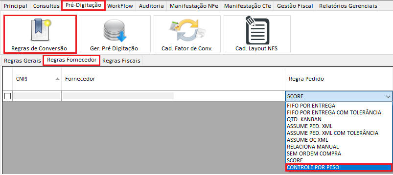 'Pré Digitação' -> 'Regras de Conversão' -> 'Regras Fornecedor'