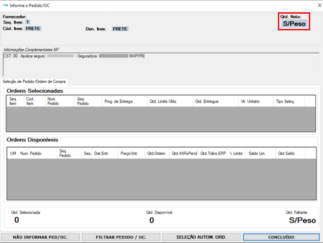 IMPORTANTE: Caso o Fornecedor não trabalhe por Controle de Peso, será aplicada a regra padrão do ANFe de acordo com a parametrização da empresa: Por QUANTIDADE ou VALOR.