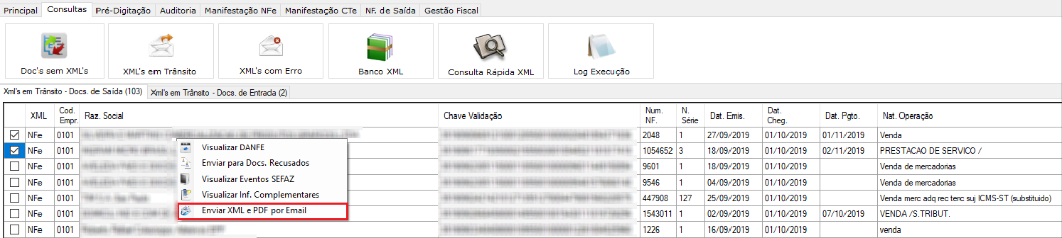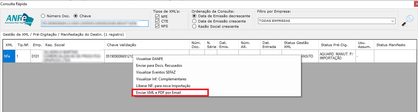 Para enviar via 'Consulta Rápida', basta consultar o documento que deseja e clicar com o botão direito do mouse para aparecer a nova opção: