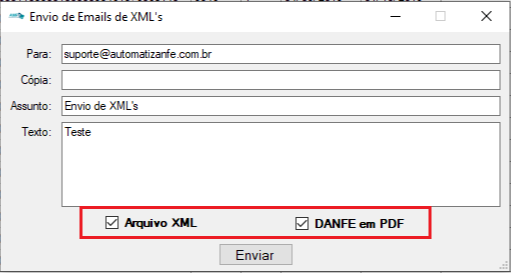 Observação:Vale lembrar que o envio de PDF só possível se estiver habilitado o Visualizador Padrão do ANFe (ver tópico: 4.7. Instalar Crystal Reports) e se for NFe. O CTe ainda é utilizado o DANFe View, então não é possível extrair seu PDF, caso marcar algum CTe para envio, será enviado apenas o seu XML.